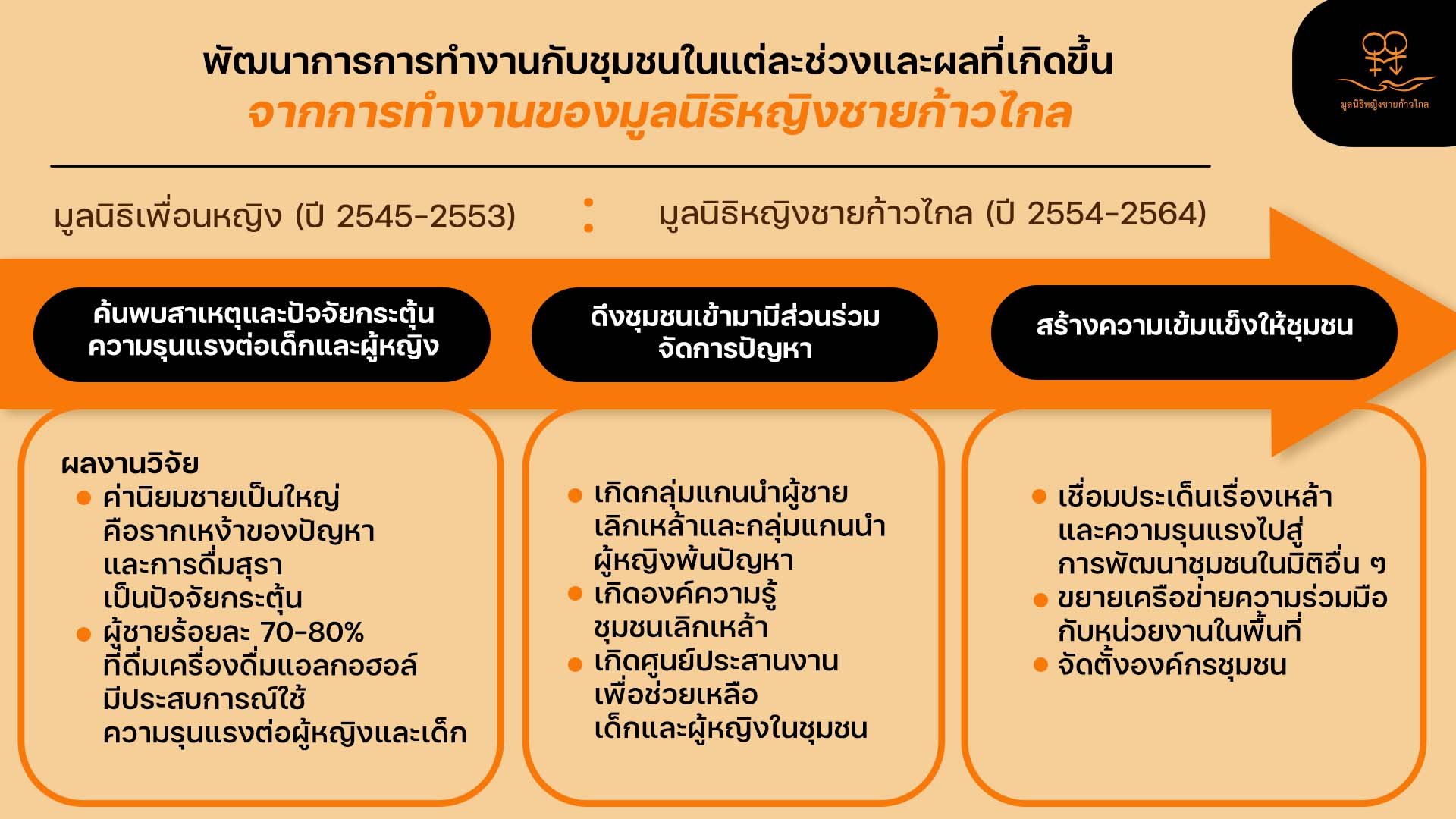 ก้าวแรกในการทำงานกับพื้นที่ชุมชนต่าง ๆ ของมูลนิธิหญิงชายก้าวไกล เริ่มต้นขึ้นเมื่อเกือบ 20 ปีที่แล้ว จากสถานการณ์ปัญหา เรื่องความรุนแรงต่อเด็กและผู้หญิงที่สั่งสมมายาวนานในสังคมไทย แต่ยังขาดหน่วยงานที่จับประเด็นนี้อย่างเกาะติดและเจาะลึกอย่างจริงจัง