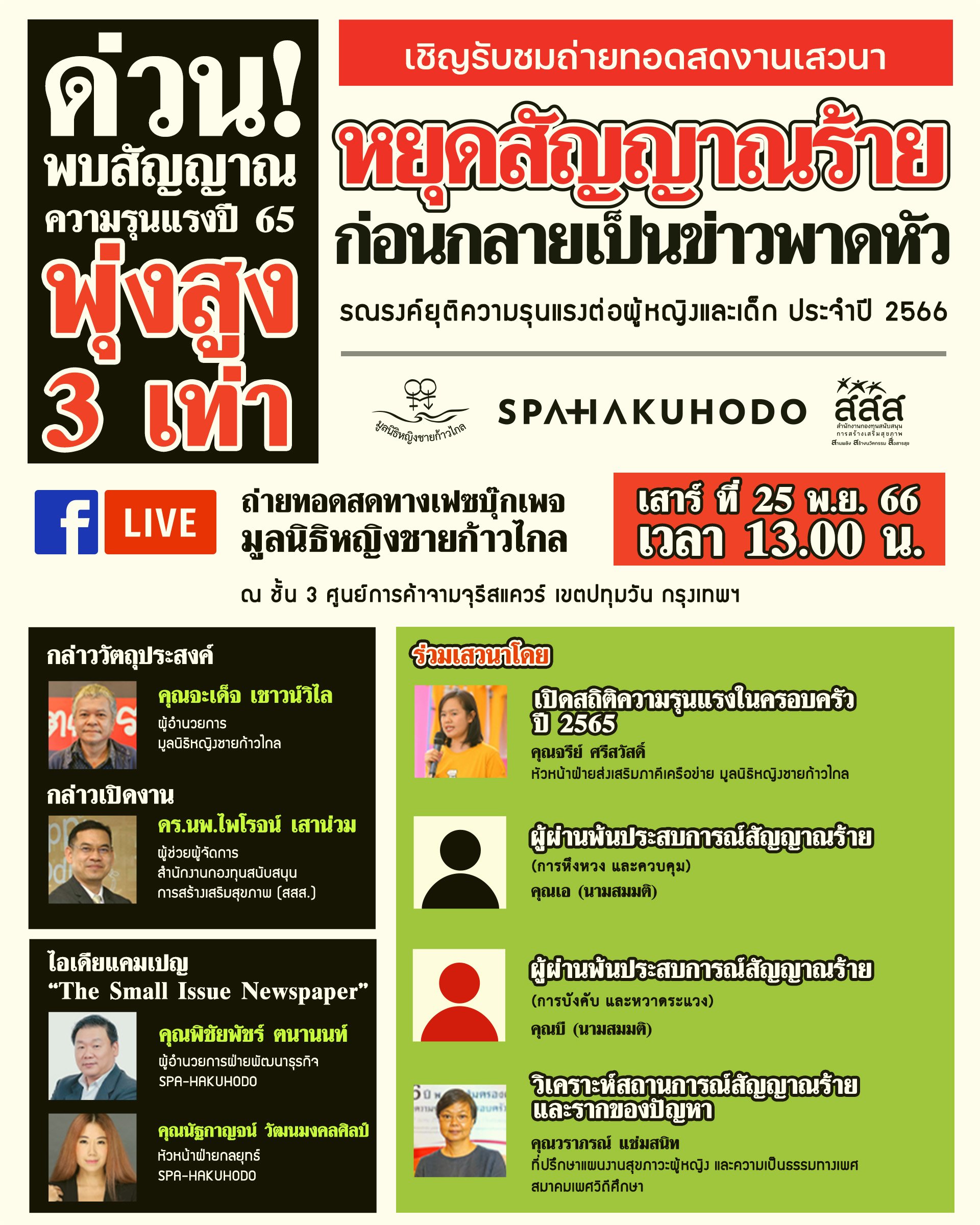 เชิญรับชมเวทีเสวนา "หยุดสัญญาณร้าย... ก่อนกลายเป็นข่าวพาดหัว" เนื่องในโอกาสรณรงค์ยุติความรุนแรงต่อผู้หญิงและเด็ก ประจำปี 2566