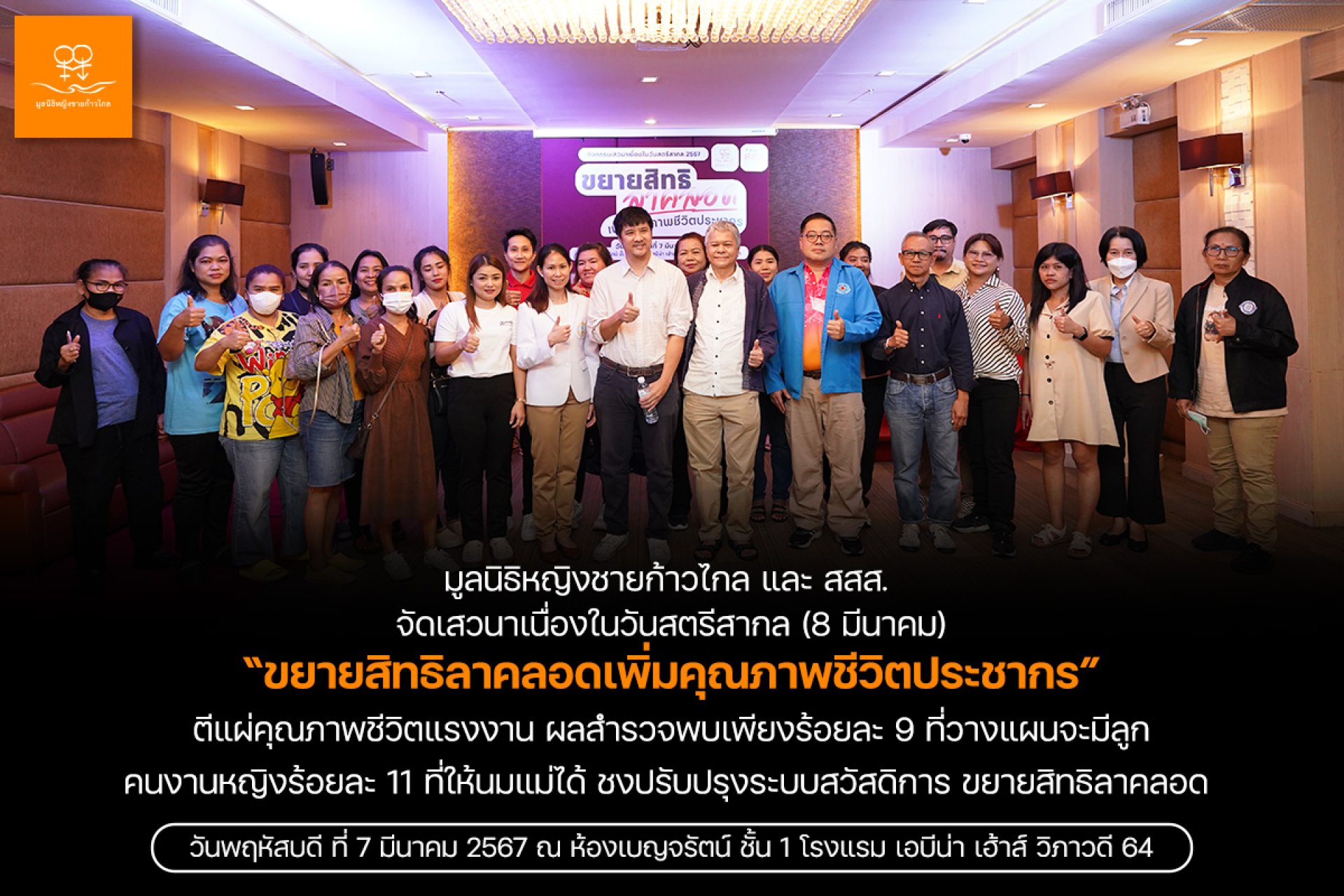 เมื่อวันที่ 7 มีนาคม 2567 มูลนิธิหญิงชายก้าวไกล ร่วมกับ สำนักงานกองทุนสนับสนุนการสร้างเสริมสุขภาพ (สสส.) จัดเสวนาเนื่องใน วันสตรีสากล หัวข้อ "ขยายสิทธิลาคลอดเพิ่มคุณภาพชีวิตประชากร" พร้อมทั้งมีการเสนอผลสำรวจ การขยายวันลาคลอด 180 วัน และสิทธิการลาเพื่อเลี้ยงดูบุตรแรกเกิด : คนงานในโรงงานอุตสาหกรรม กทม.และจังหวัดโดยรอบ จากนั้นได้แสดงละครสะท้อนชีวิตแรงงานกับการลาคลอดด้วย