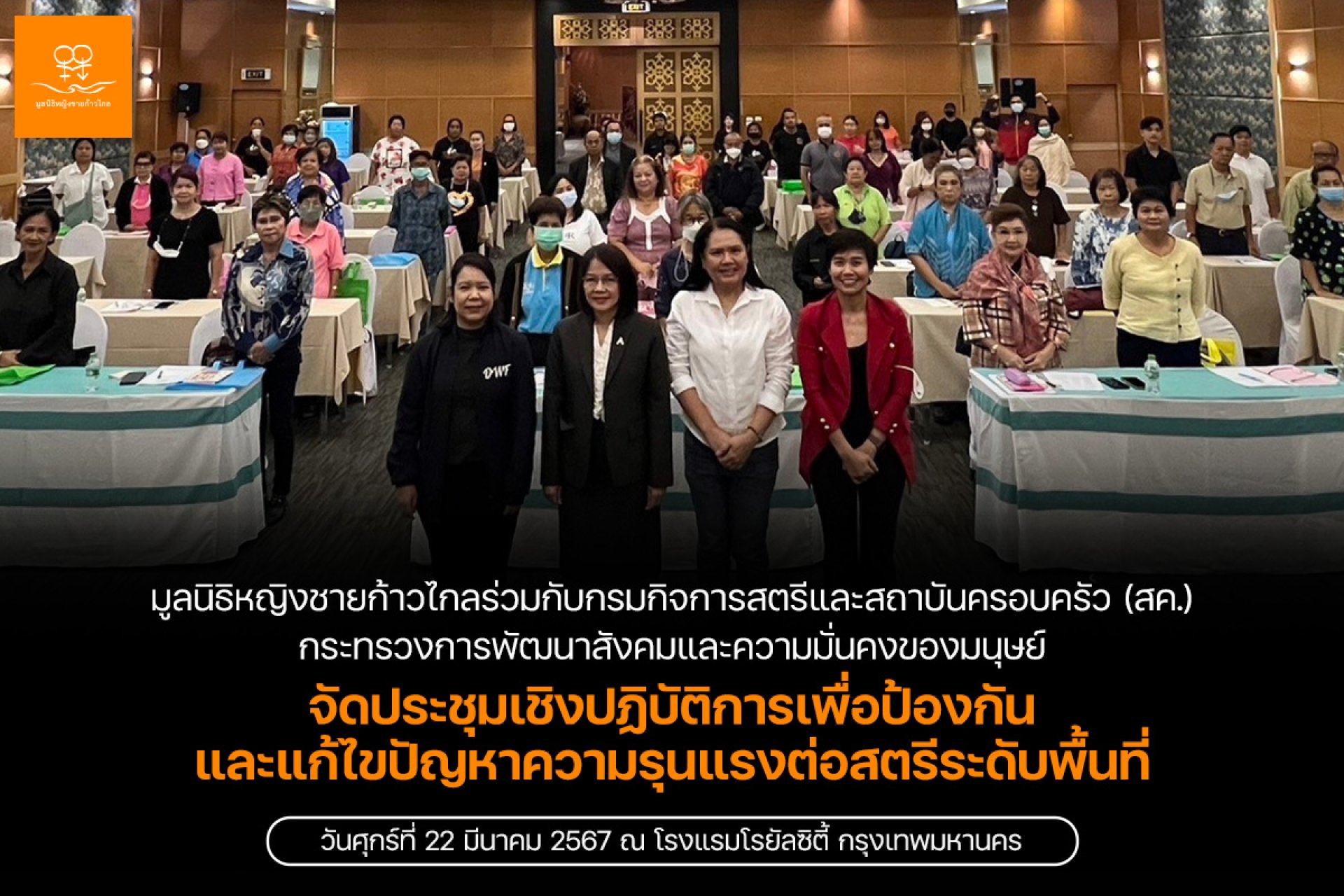 วันศุกร์ที่ 22 มีนาคม 2567 มูลนิธิหญิงชายก้าวร่วมกับกรมกิจการสตรีและสถาบันครอบครัว (สค.) กระทรวงการพัฒนาสังคมและความมั่นคงของมนุษย์ จัดประชุมเชิงปฏิบัติการเพื่อป้องกันและแก้ไขปัญหาความรุนแรงต่อสตรีระดับพื้นที่