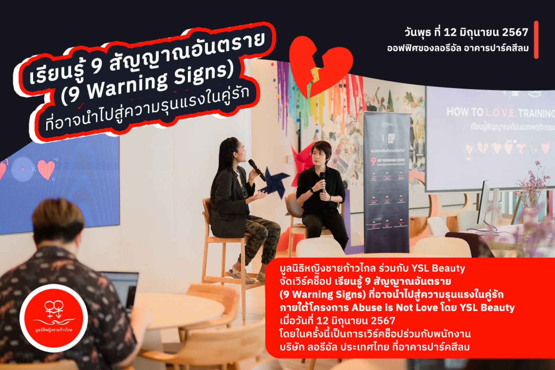 มูลนิธิหญิงชายก้าวไกล ร่วมกับ YSL Beauty จัดเวิร์คช็อป เรียนรู้ 9 สัญญาณอันตราย (9 Warning Signs) ที่อาจนำไปสู่ความรุนแรงในคู่รัก ภายใต้โครงการ Abuse is Not Love โดย YSL Beauty เมื่อวันที่ 12 มิถุนายน 2567 โดยในครั้งนี้เป็นการเวิร์คช็อปร่วมกับพนักงานบริษัท ลอรีอัล ประเทศไทย ที่อาคารปาร์คสีลม