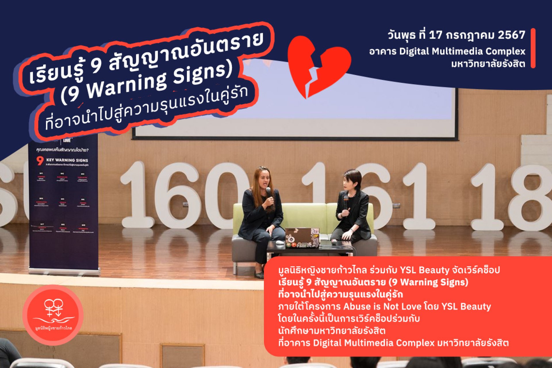 มูลนิธิหญิงชายก้าวไกล ร่วมกับ YSL Beauty จัดเวิร์คช็อป เรียนรู้ 9 สัญญาณอันตราย (9 Warning Signs) ที่อาจนำไปสู่ความรุนแรงในคู่รัก ภายใต้โครงการ Abuse is Not Love โดย YSL Beauty เมื่อวันที่ 17 กรกฎาคม 2567