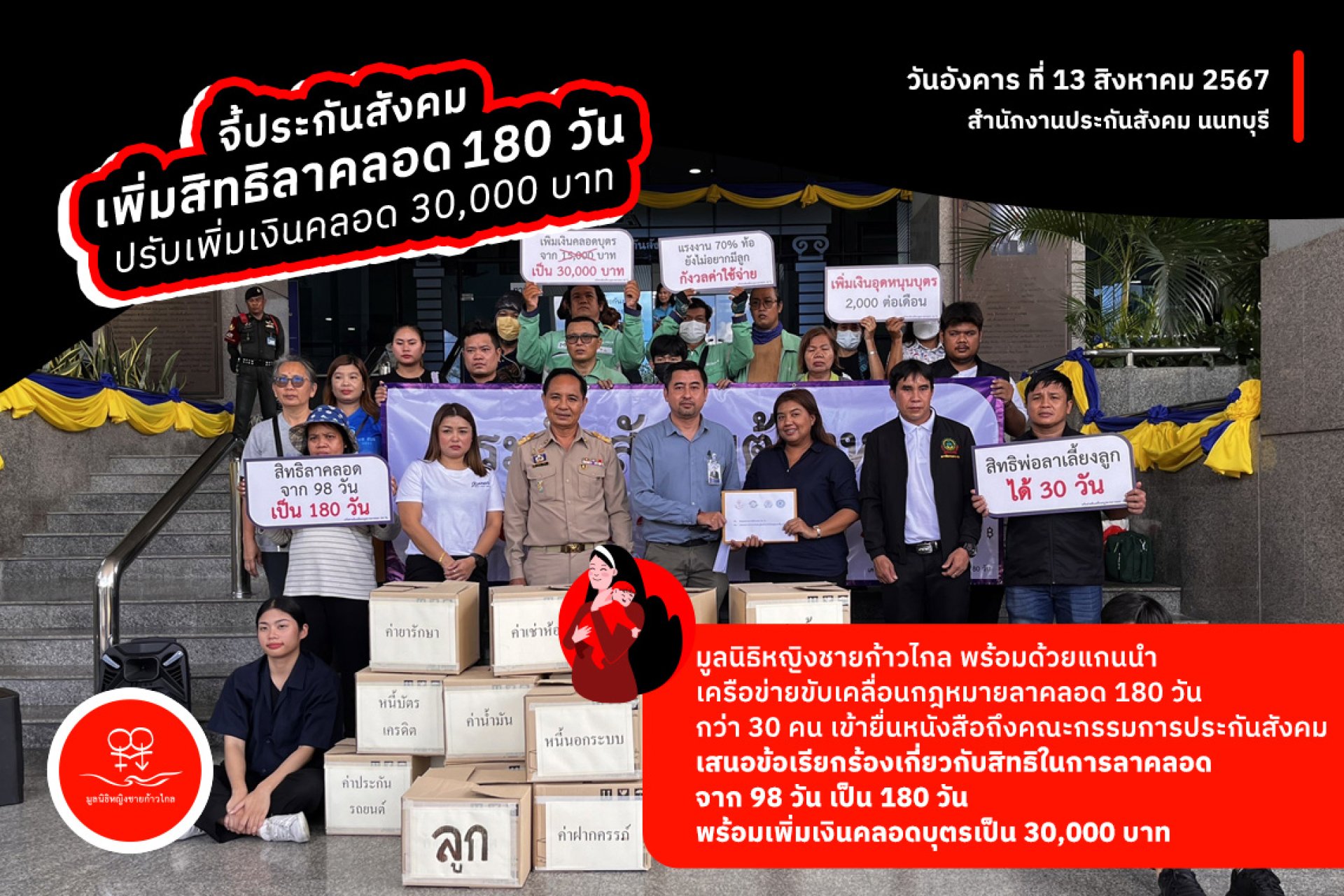 วันที่ 13 สิงหาคม 2567 เวลา 10.00 น. ที่สำนักงานประกันสังคม นนทบุรี มูลนิธิหญิงชายก้าวไกล พร้อมด้วยแกนนำเครือข่ายขับเคลื่อนกฎหมายลาคลอด 180 วัน ประกอบด้วย สหภาพแรงงานย่านรังสิตและใกล้เคียง สหภาพแรงงานกิจการสิ่งทอนครหลวง และสภาองค์กรลูกจ้างพัฒนาแรงงานแห่งประเทศไทย กว่า 30 คน เข้ายื่นหนังสือถึงคณะกรรมการประกันสังคม เสนอข้อเรียกร้องเกี่ยวกับสิทธิในการลาคลอด