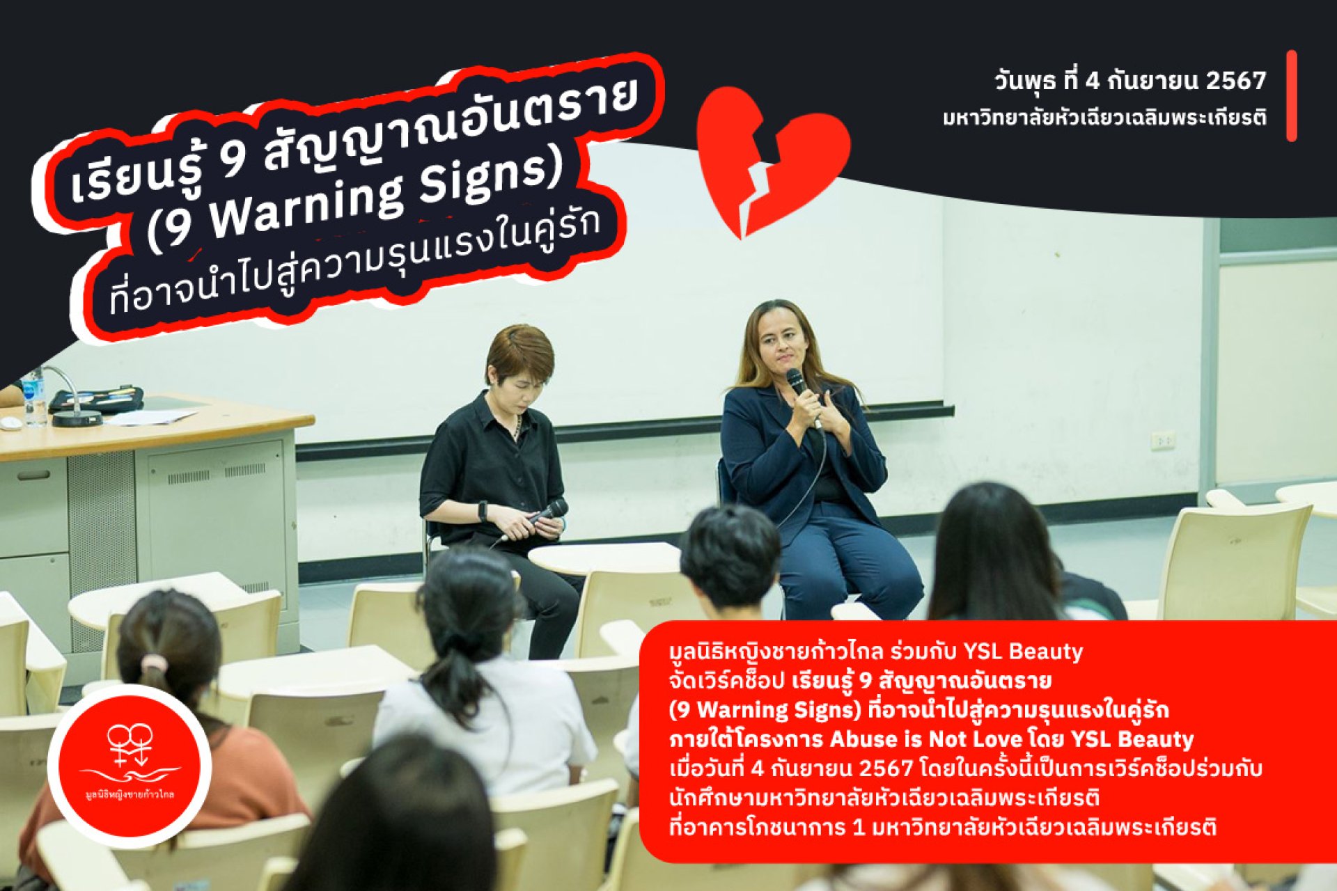 มูลนิธิหญิงชายก้าวไกล ร่วมกับ YSL Beauty จัดเวิร์คช็อป เรียนรู้ 9 สัญญาณอันตราย (9 Warning Signs) ที่อาจนำไปสู่ความรุนแรงในคู่รัก ภายใต้โครงการ Abuse is Not Love โดย YSL Beauty เมื่อวันที่ 4 กันยายน 2567