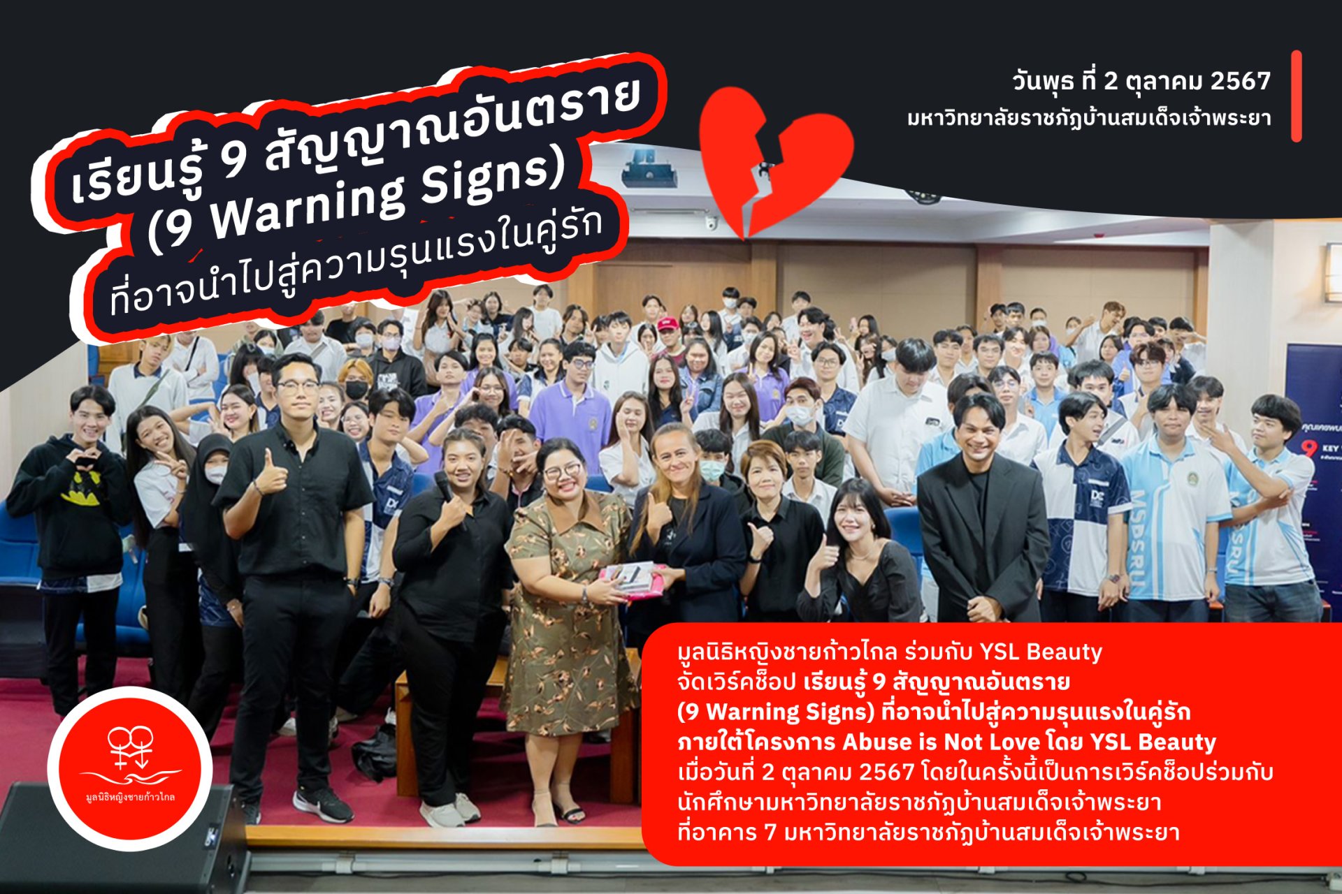 มูลนิธิหญิงชายก้าวไกล ร่วมกับ YSL Beauty จัดเวิร์คช็อป เรียนรู้ 9 สัญญาณอันตราย (9 Warning Signs) ที่อาจนำไปสู่ความรุนแรงในคู่รัก ภายใต้โครงการ Abuse is Not Love โดย YSL Beauty เมื่อวันที่ 2 ตุลาคม 2567