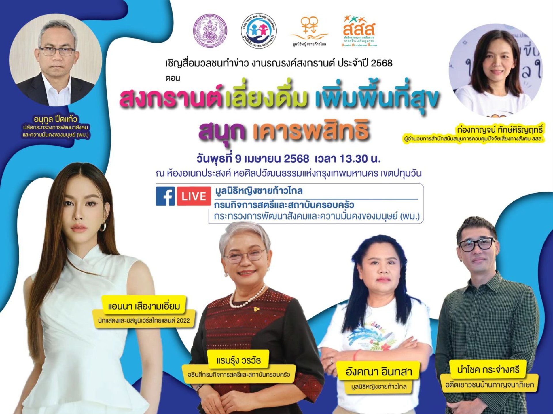 วันพุธที่ 9 เมษายน 2568 เวลา 13.30 น. เป็นต้นไป ถ่ายทอดสดทางเฟซบุ๊กเพจ มูลนิธิหญิงชายก้าวไกล และ กรมกิจการสตรีและสถาบันครอบครัว