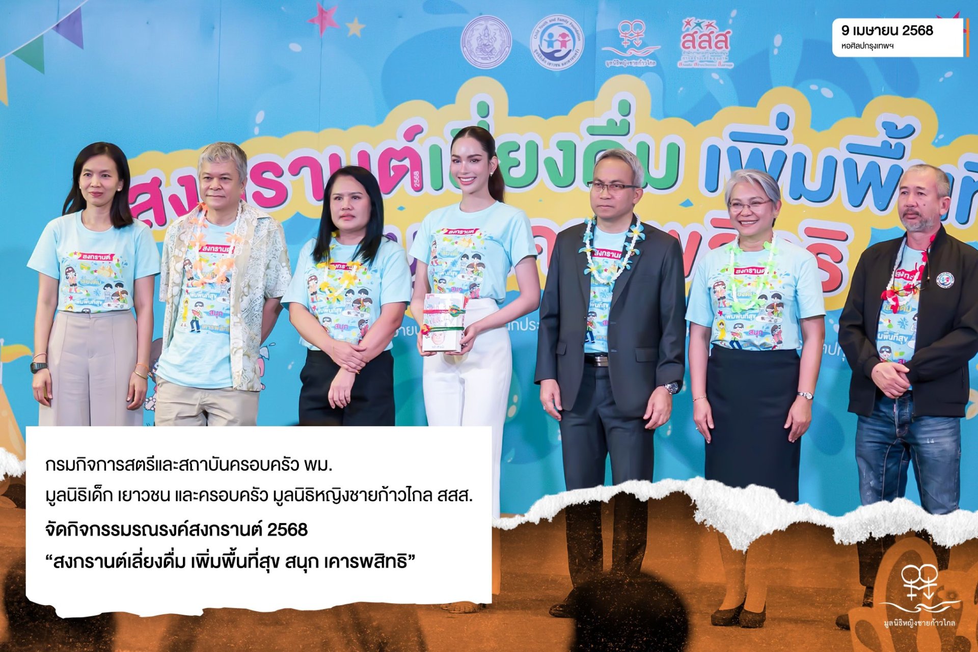เมื่อวันที่ 9 เมษายน 2568 ที่หอศิลปวัฒนธรรมแห่งกรุงเทพมหานคร กรมกิจการสตรีและสถาบันครอบครัว กระทรวงการพัฒนาสังคมและความมั่นคงของมนุษย์ (พม.) มูลนิธิเด็ก เยาวชน และครอบครัว มูลนิธิหญิงชายก้าวไกล สนับสนุนโดย สำนักงานกองทุนสนับสนุนการสร้างเสริมสุขภาพ (สสส.) ร่วมกันจัดกิจกรรมรณรงค์สงกรานต์ ประจำปี 2568 สงกรานต์เลี่ยงดื่ม เพิ่มพื้นที่สุข สนุก เคารพสิทธิ พร้อมทำกิจกรรมขบวนแห่กลองยาวเชิญชวนร่วมงาน สงกรานต์เลี่ยงดื่ม เพิ่มพื้นที่สุข สนุก เคารพสิทธิ และแจกสื่อรณรงค์