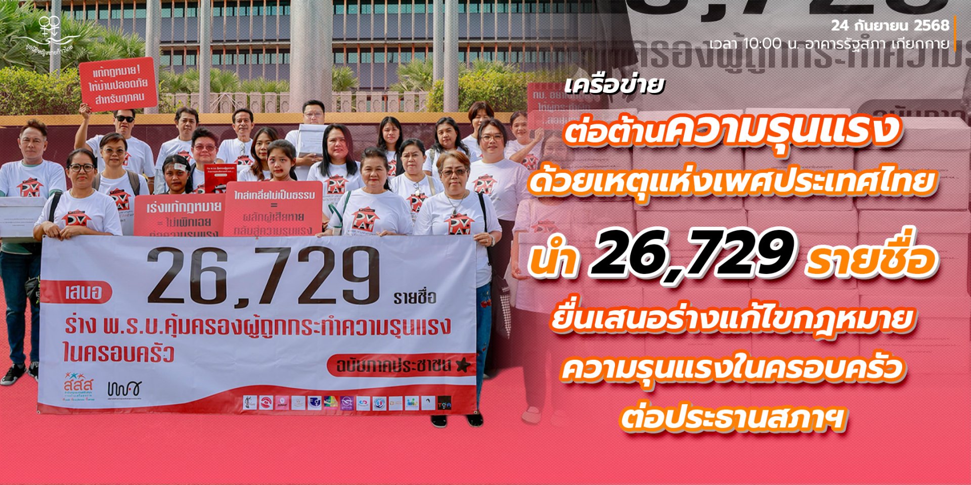 ภาคประชาชนนำ 26,729 รายชื่อ ยื่นร่างแก้ไขกฎหมายความรุนแรงในครอบครัวต่อประธานสภาฯ วอน ครม. อนุทิน และพรรคการเมืองอย่าเพิกเฉย เร่งแก้กฎหมายให้คุ้มครองผู้ถูกกระทำและลดปัญหาความรุนแรงในครอบครัวได้จริง