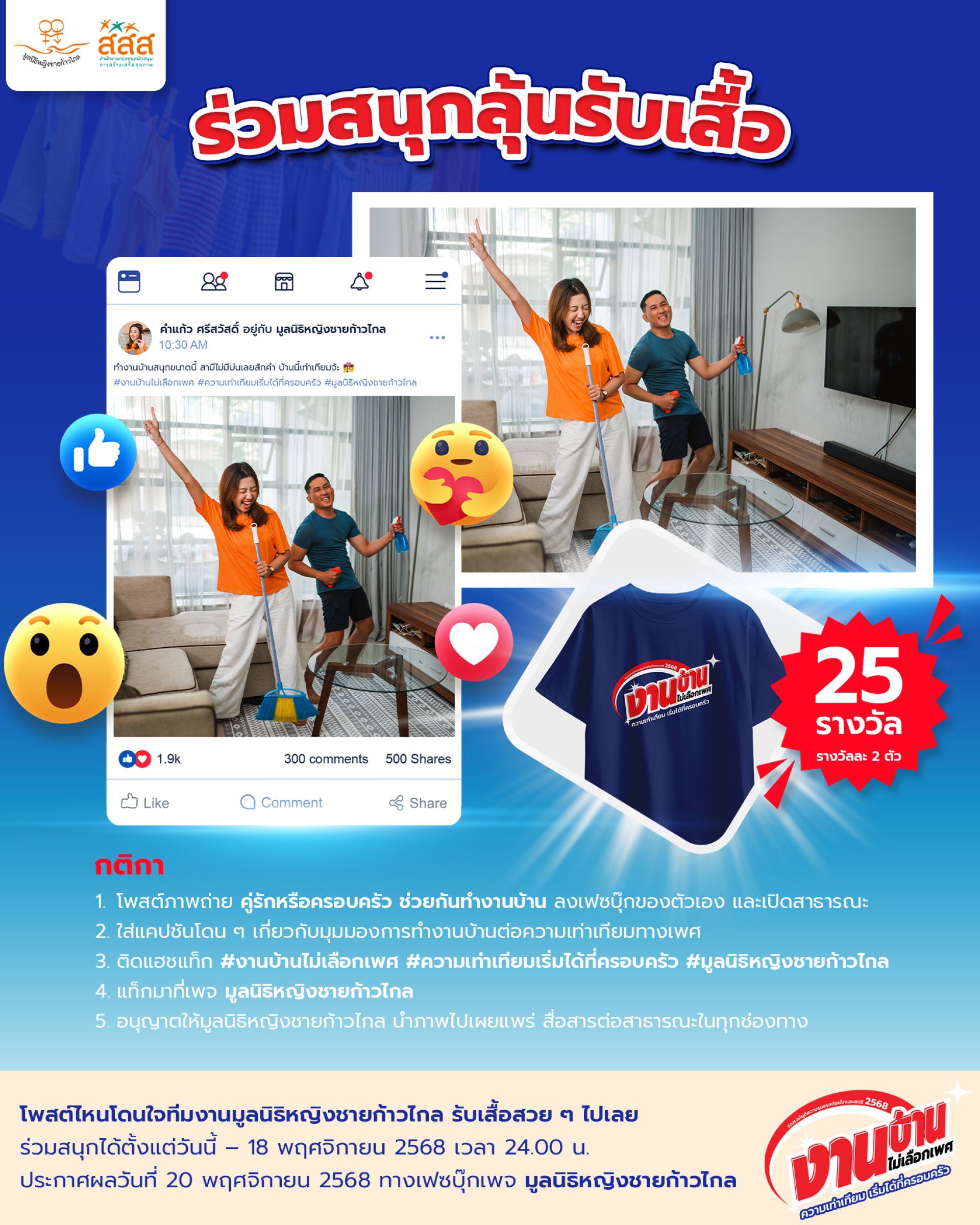 มูลนิธิหญิงชายก้าวไกลชวนทุกท่านร่วมสนุก ลุ้นรับเสื้อสวย ๆ จากแคมเปญ งานบ้านไม่เลือกเพศ ความเท่าเทียมเริ่มได้ที่ครอบครัว จำนวน 25 รางวัล รางวัลละ 2 ตัว