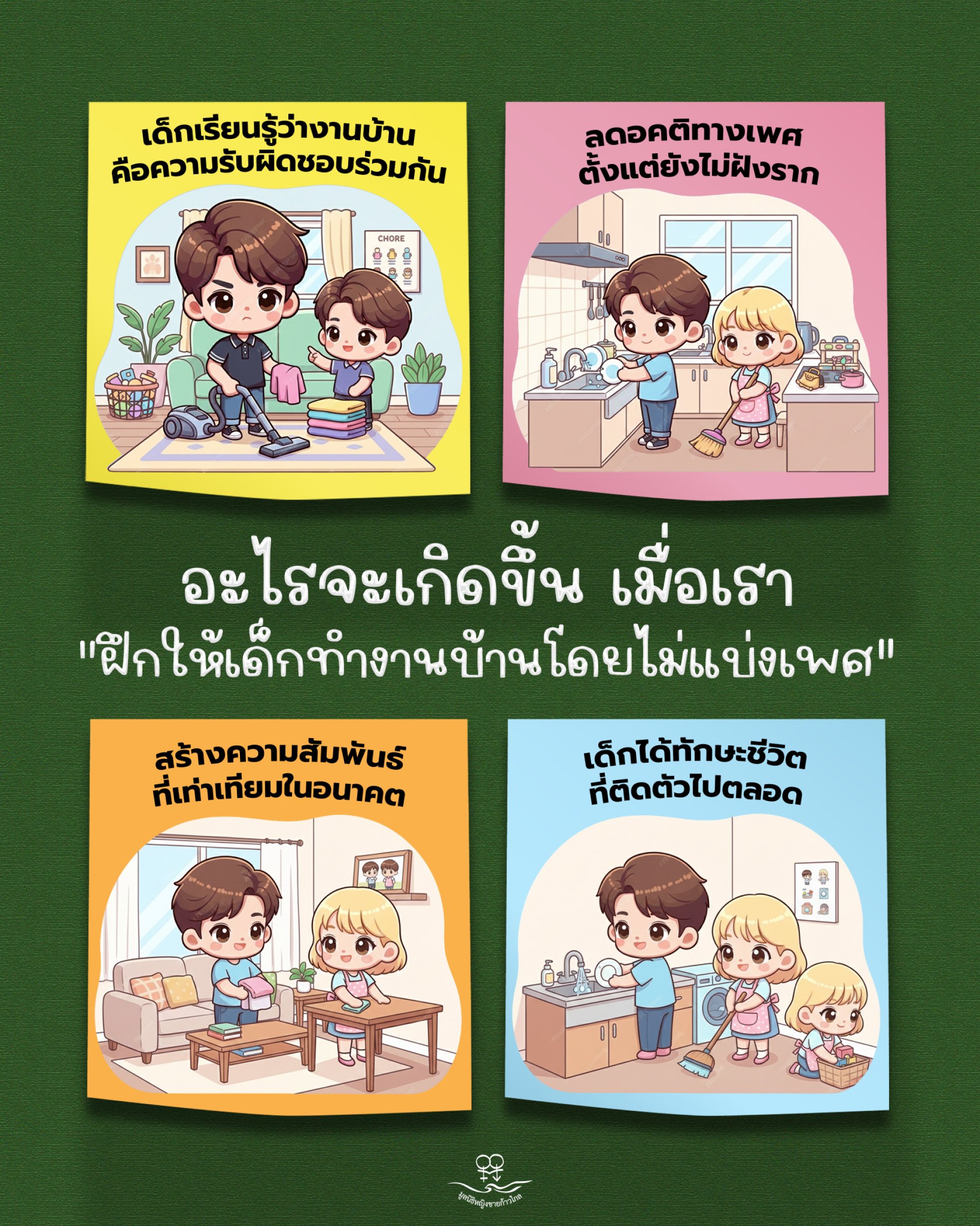 การทำงานบ้านคือการฝึก การจัดการเวลา ความอดทน การแก้ปัญหาเฉพาะหน้าและความภูมิใจในตัวเอง ไม่ว่าเด็กจะเติบโตเป็นใคร ทำอาชีพอะไร ทักษะเหล่านี้จะไม่สูญเปล่า "งานบ้านไม่เลือกเพศ ความเท่าเทียมเริ่มได้ที่ครอบครัว"