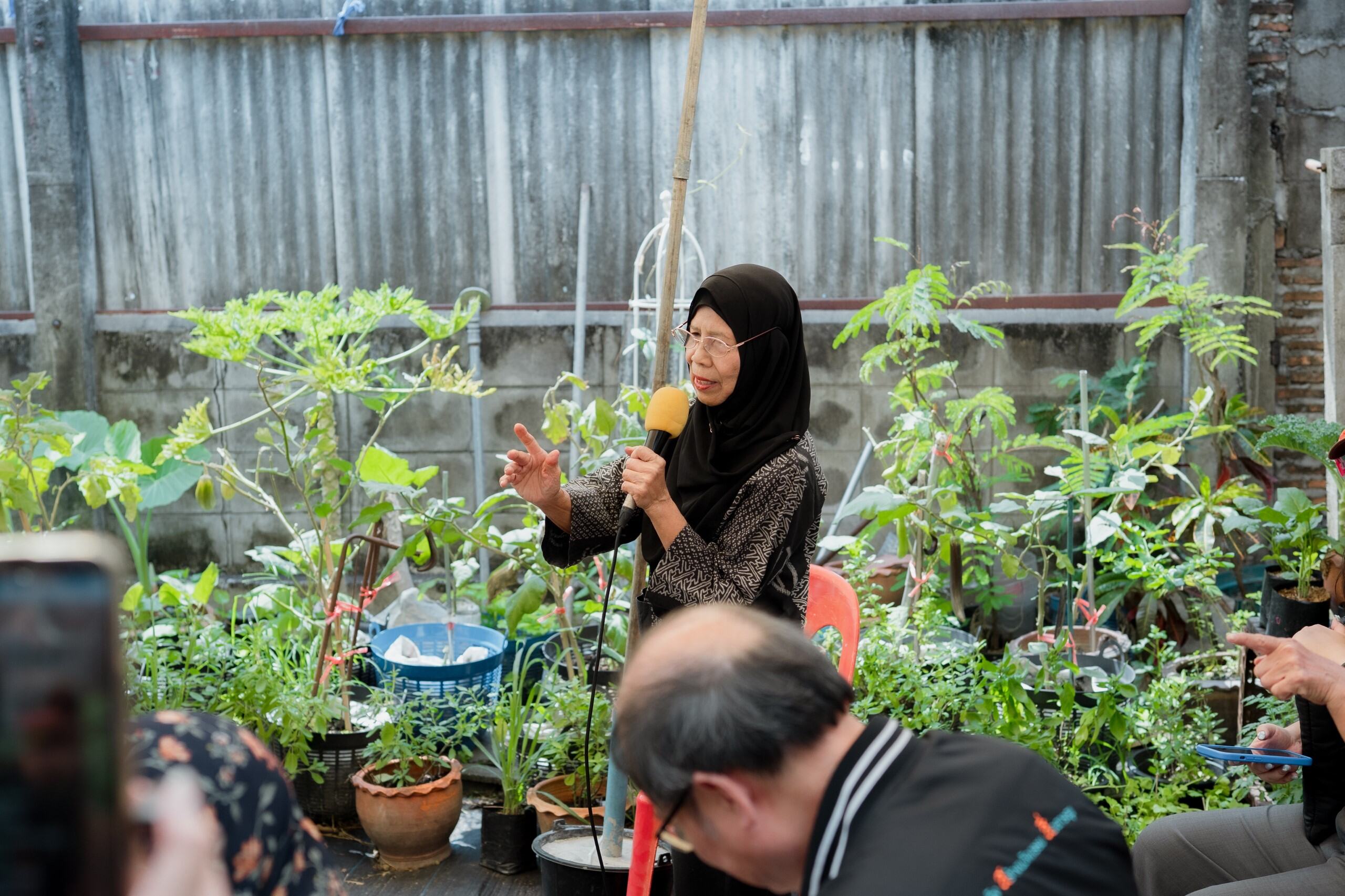 นี่จึงเป็นจุดที่ประเด็น “อาหาร” เข้ามาเชื่อมต่อ การทำงานร่วมกับมูลนิธิชีววิถี เปิดโอกาสให้คนในชุมชน โดยเฉพาะกลุ่มเปราะบาง ผู้หญิงที่เคยเผชิญความรุนแรง ได้เข้ามามีส่วนร่วมในกิจกรรมปลูกผักสวนครัว แม้จะเป็นชุมชนเมืองที่มีพื้นที่จำกัด