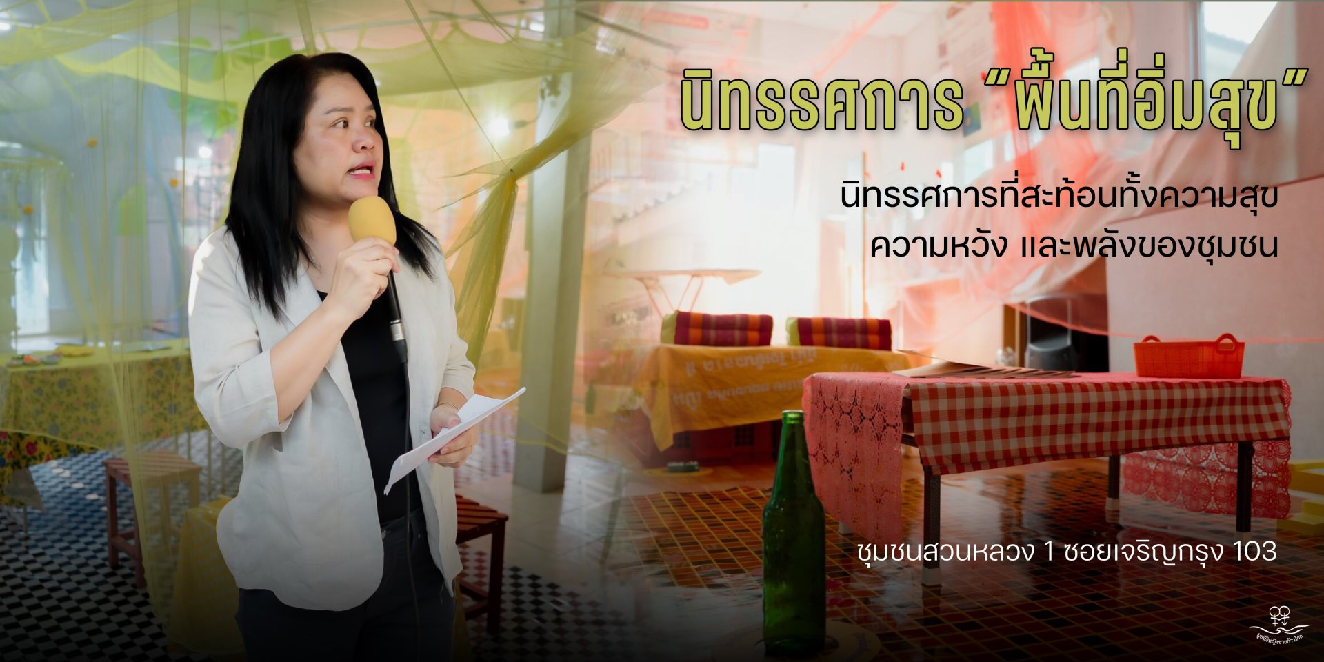 นิทรรศการ “พื้นที่อิ่มสุข” ที่จัดขึ้นในชุมชนสวนหลวง 1 (ซอยเจริญกรุง 103) ภายใต้งาน Bangkok Design Week 2026 โดยการมีส่วนร่วมสร้างสรรค์ของเครือข่ายชุมชนเมือง 5 พื้นที่ ได้แก่ ชุมชนสวนหลวง 1 ชุมชนซอยพระเจน ชุมชนวัดสวัสดิ์วารีสีมาราม ชุมชนเคหะคลองเก้า และสมาคมส่งเสริมสิทธิชุมชนเพื่อการพัฒนา (ชุมชนไทยเกรียง) อาจดูเหมือนกิจกรรมเล็ก ๆ ในชุมชนเมืองที่มีพื้นที่จำกัด แต่เบื้องหลังพื้นที่เล็ก ๆ แห่งนี้ คือเรื่องราวการเดินทางยาวนานของการทำงานด้านความเสมอภาคทางเพศ การลดความรุนแรงในครอบครัว และการเยียวยาคนด้วยพลังของชุมชน