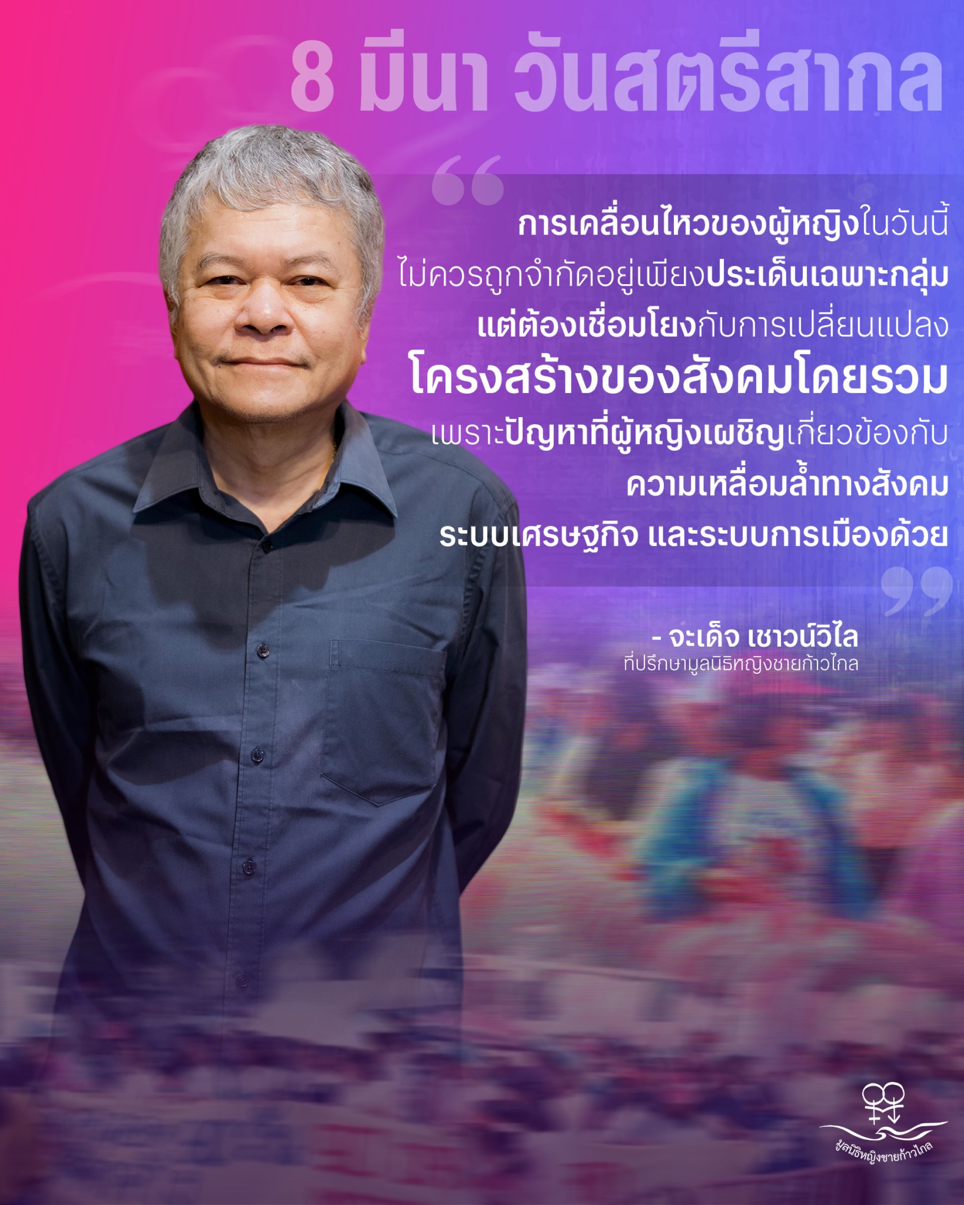 ท้ายที่สุด คุณจะเด็จย้ำว่า การเคลื่อนไหวของผู้หญิงในวันนี้ไม่ควรถูกจำกัดอยู่เพียงประเด็นเฉพาะกลุ่ม แต่ต้องเชื่อมโยงกับการเปลี่ยนแปลงโครงสร้างของสังคมโดยรวม เพราะปัญหาที่ผู้หญิงเผชิญไม่ได้เกิดจากปัจจัยส่วนบุคคลเพียงอย่างเดียว แต่เกี่ยวข้องกับความเหลื่อมล้ำทางสังคม ระบบเศรษฐกิจ และระบบการเมืองด้วย