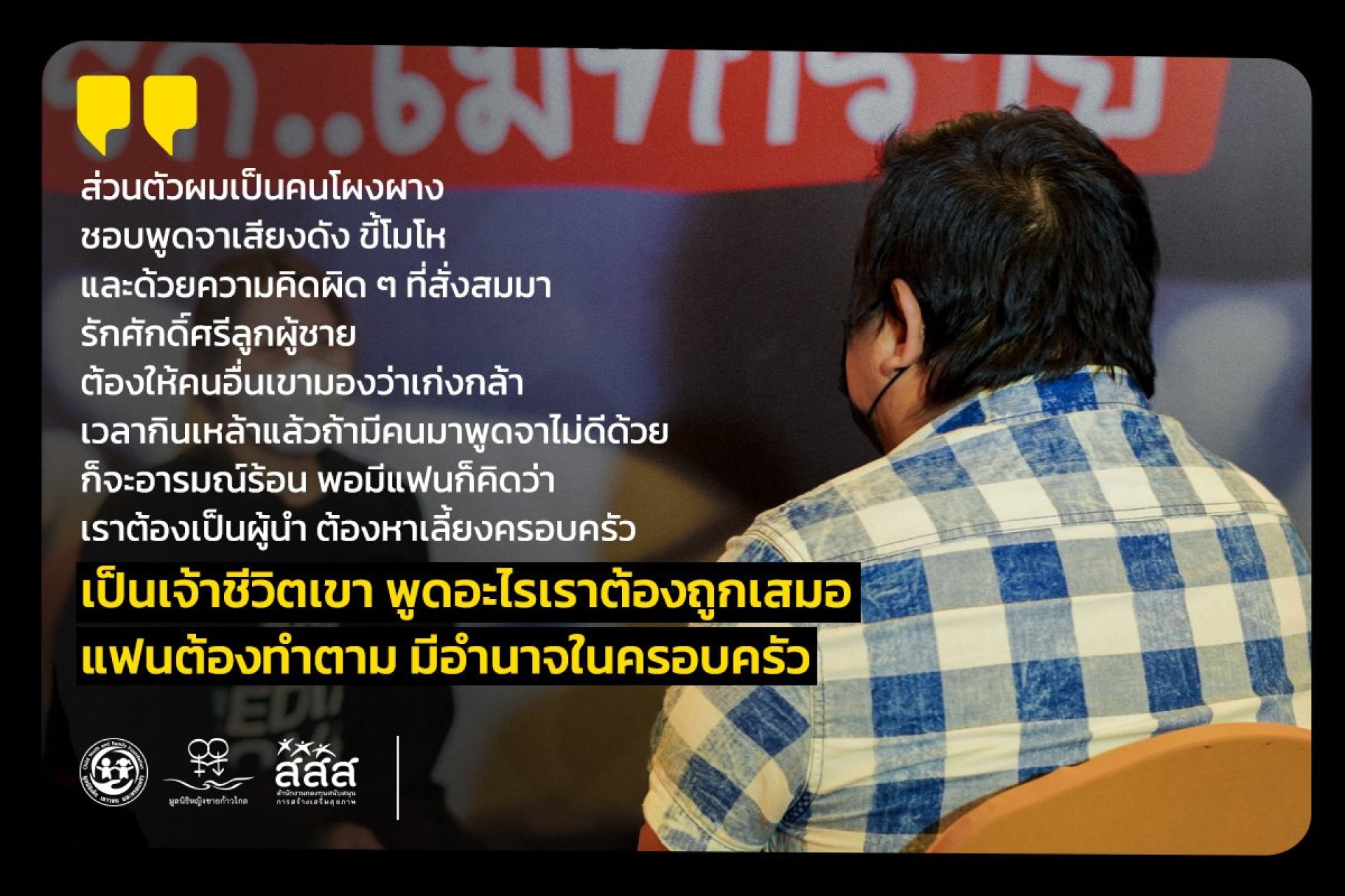 “ส่วนตัวผมเป็นคนโผงผาง ชอบพูดจาเสียงดัง ขี้โมโห และด้วยความคิดผิด ๆ ที่สั่งสมมา รักศักดิ์ศรีลูกผู้ชาย ต้องให้คนอื่นเขามองว่าเก่งกล้า เวลากินเหล้าแล้วถ้ามีคนมาพูดจาไม่ดีด้วยก็จะอารมณ์ร้อน พอมีแฟนก็คิดว่าเราต้องเป็นผู้นำ ต้องหาเลี้ยงครอบครัว เป็นเจ้าชีวิตเขา พูดอะไรเราต้องถูกเสมอ แฟนต้องทำตาม มีอำนาจในครอบครัว”