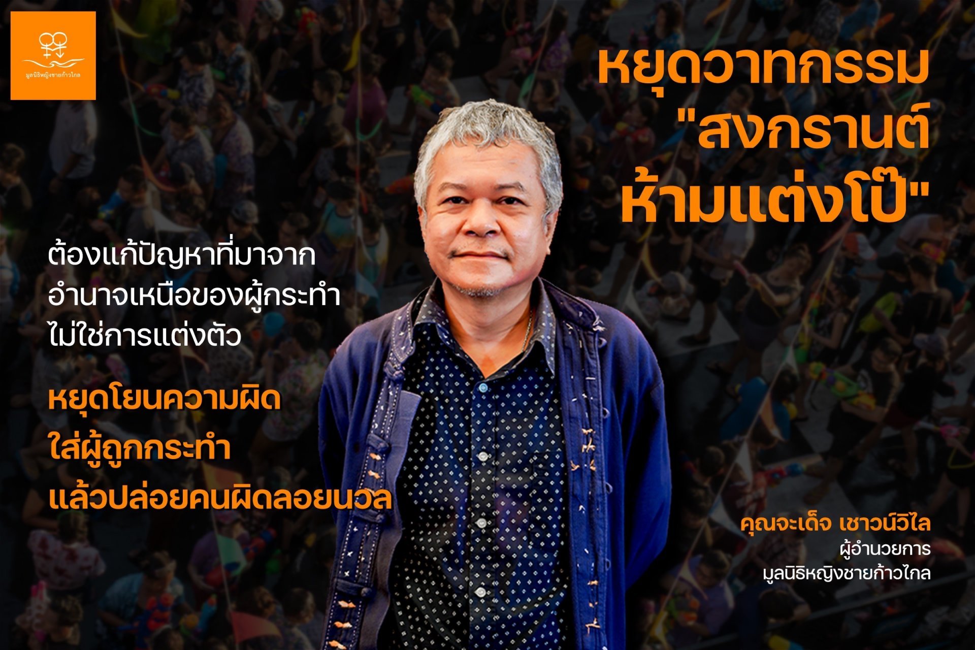 จากกรณี คุณชัชชาติ สิทธิพันธุ์ ผู้ว่าราชการกรุงเทพมหานคร (กทม.) แถลงข่าวจัดงานเทศกาลสงกรานต์ กทม. 2566 “สืบสานวิถีไทย ร่วมใจสู่สากล” ระบุว่าให้การขายและดื่มเครื่องดื่มแอลกอฮอล์เป็นไปตามกฎหมายอย่างเคร่งครัด ห้ามเล่นแป้ง และกระบอกฉีดน้ำแรงดันสูงนั้น คุณจะเด็จ เชาวน์วิไล ผู้อำนาวยการมูลนิธิหญิงชายก้าวไกล กล่าวว่า ในประเด็นเหล่านี้ตนไม่ติดใจอะไร แต่ที่ติดใจและผิดหวังมากคือการที่ผู้ว่าฯ ได้เน้นย้ำว่าห้ามแต่งตัวโป๊ วาบหวิวเล่นสงกรานต์ เพราะเสี่ยงที่จะถูกคุกคามทางเพศ ทั้งที่จริง ๆ แล้วปัญหาไม่ได้อยู่ที่การแต่งตัวโป๊หรือวาบหวิวเลย สาเหตุที่แท้จริงของการคุกคามทางเพศ มาจากอำนาจที่เหนือกว่าของผู้กระทำ โดยเฉพาะช่วงเทศกาลสงกรานต์จะเห็นผู้กระทำมักจับกลุ่มกันทำพฤติกรรมลวนลามทางเพศ และส่วนใหญ่มีอาการมึนเมา เช่น แตะเนื้อต้องตัว ใช้แป้งเป็นข้ออ้างเข้าไปสัมผัสอวัยวะต่าง ๆ ของผู้ถูกกระทำไม่ว่าจะแต่งตัวอย่างไร อายุเท่าไร ก็ถูกคุกคามทางเพศได้ จุดนี้เราขอยืนยัน