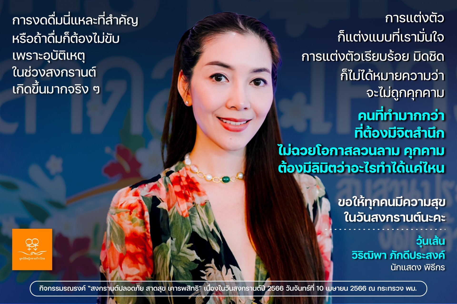 “ส่วนเรื่องของอุบัติเหตุ สำหรับวุ้น การงดดื่มนี่แหละที่สำคัญ หรือถ้าดื่มก็ต้องไม่ขับ เพราะอุบัติเหตุในช่วงสงกรานต์เกิดขึ้นมากจริง ๆ ส่วนการแต่งตัวก็แต่งแบบที่เรามั่นใจนั่นแหละ เพราะถึงจะแต่งตัวเรียบร้อย มิดชิด ก็ไม่ได้หมายความว่าจะไม่โดนคุกคาม แต่คนที่ทำมากกว่าที่ต้องมีจิตสำนึก ไม่ฉวยโอกาสลวนลาม คุกคาม ต้องมีลิมิตว่าอะไรทำได้แค่ไหน ขอให้ทุกคนมีความสุขในวันสงกรานต์นะคะ”