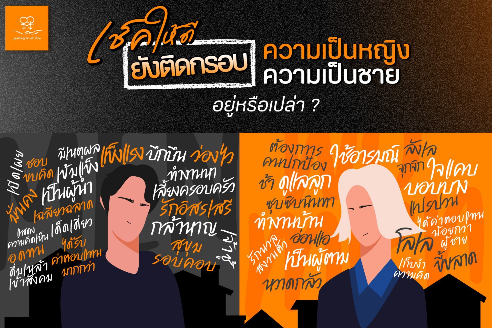 วันนี้เราขอชวนทุกคนมาทบทวนกรอบความเป็นหญิงความเป็นชาย จากข้อความในภาพทั้งสองฝั่ง มีข้อไหนที่ตรงกับความคิด ทัศนคติ หรือความเชื่อของตัวเองบ้างหรือไม่