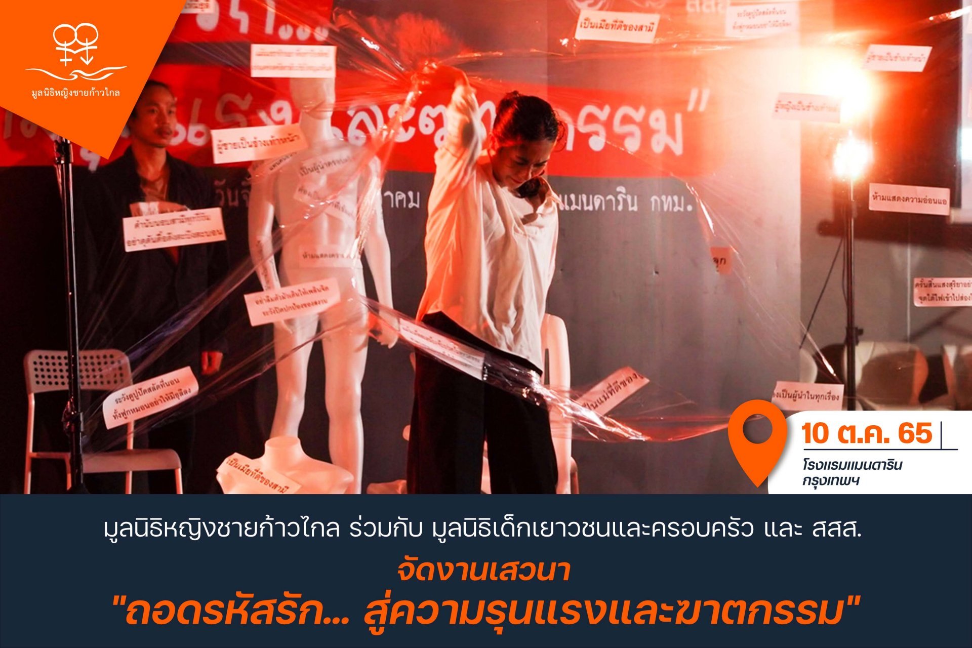 เมื่อวันที่ 10 ตุลาคม 2565 ที่โรงแรมแมนดาริน สามย่าน กทม. มูลนิธิหญิงชายก้าวไกล ร่วมกับมูลนิธิเด็ก เยาวชน และครอบครัว สนับสนุนโดยสำนักงานกองทุนสนับสนุนการสร้างเสริมสุขภาพ (สสส.) จัดเสวนาหัวข้อ “ถอดรหัสรัก...สู่ความรุนแรงและฆาตกรรม” พร้อมทำการแสดงเชิงสัญลักษณ์ ชุด “สมบัติ...รัก” โดยเครือข่ายละครเฉพาะกิจเธียเตอร์