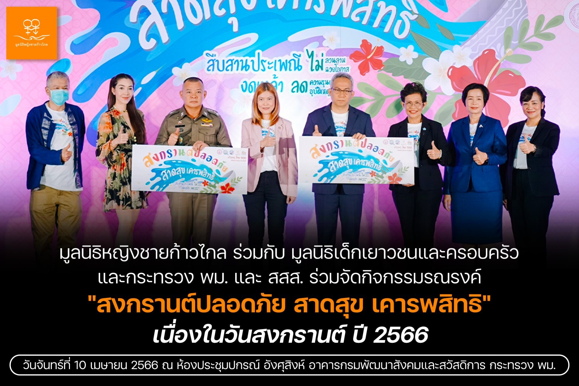 เมื่อวันที่ 10 เม.ย. 2566 ที่กรมพัฒนาสังคมและสวัสดิการ กรุงเทพฯ กระทรวงพัฒนาสังคมและความมั่นคงของมนุษย์ (พม.) ร่วมกับ สำนักงานกองทุนสนับสนุนการสร้างเสริมสุขภาพ(สสส.), มูลนิธิหญิงชายก้าวไกล, สำนักงานตำรวจแห่งชาติ และมูลนิธิเด็กเยาวชนและครอบครัว จัดกิจกรรมรณรงค์เนื่องในวันสงกรานต์ ปี 2566 “สงกรานต์ปลอดภัย สาดสุข เคารพสิทธิ” โดยมีนายอนุกูล ปีดแก้ว ปลัดกระทรวงการพัฒนาสังคมและความมั่นคงของมนุษย์ (พม.) เป็นประธานเปิดกิจกรรมรณรงค์ นอกจากนี้ยังมีการเสวนาหัวข้อ “สงกรานต์ปลอดภัย สาดสุข เคารพสิทธิ… เราทำได้”