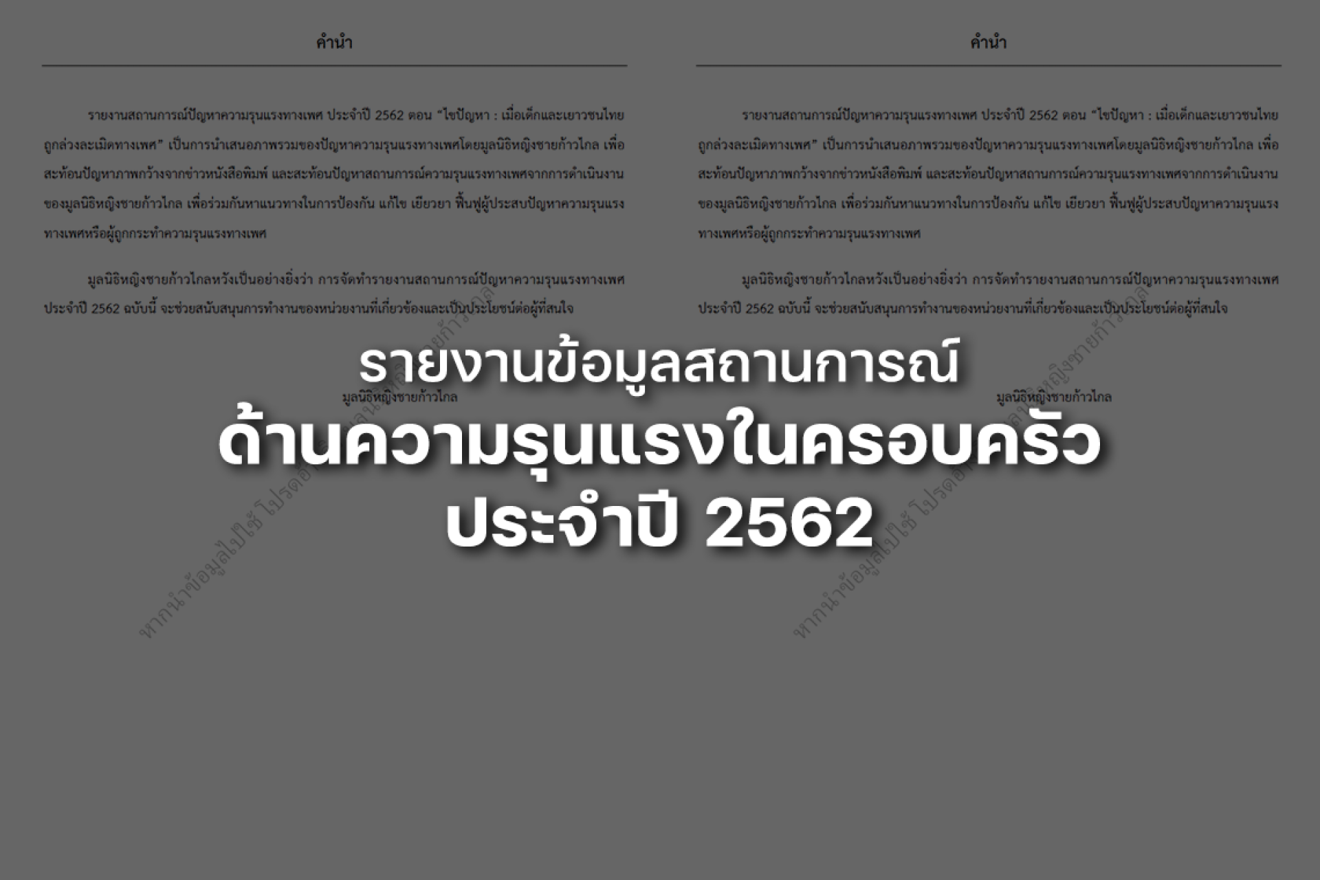 รายงานสถานการณ์ปัญหาความรุนแรงทางเพศ ประจำปี 2562 ตอน “ไขปัญหา เมื่อเด็กและเยาวชนไทยถูกล่วงละเมิดทางเพศ” สะท้อนปัญหาภาพกว้างจากข่าวหนังสือพิมพ์ และสะท้อนปัญหาสถานการณ์ความรุนแรงทางเพศเพื่อร่วมกันหาแนวทางในการป้องกัน แก้ไข เยียวยา ฟื้นฟูผู้ประสบปัญหาความรุนแรงทางเพศหรือผู้ถูกกระทำความรุนแรงทางเพศ
